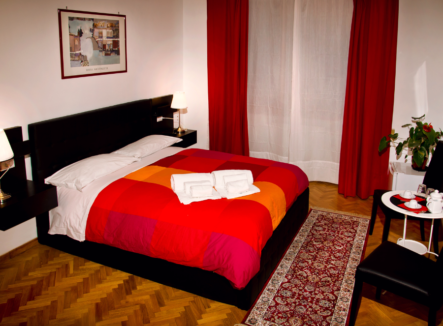 La camera, molto ampia, è l’ideale per chi viaggia in coppia o con bambini e vuole passare il suo soggiorno nel centro di Roma. La camera, dotata di letto matrimoniale con la possibilità di un letto aggiuntivo, permette un pernottamento tranquillo con la possibilità di gestire la temperatura dell’ambiente autonomamente; usufruire del servizio di prima colazione che verrà servito dalle prime ore del mattino fino alle 11 nella sala comune; Il servizio prevede la pulizia della stanza tutti i giorni dalle 10 a mezzogiorno, il cambio della biancheria ogni 4;